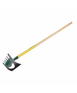 Binette et râteau : 1 côté pour sarcler les mauvaises herbes, 2 faces latérales moins larges pour casser la croûte du sol, 1 côté cranté pour ramasser les herbes coupées et niveler