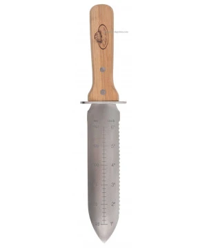 C’est Ă la fois un couteau, une scie, un outil pour bĂŞcher, transplanter ou mĂŞme mesurer les profondeurs pour planter les bulbes (en cm et en pouces).