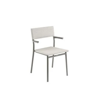 Les accoudoirs sont en alu et ultra-résistants avec une enveloppe en polymère moucheté et effet ondulé permettant au fauteuil d’être suspendu à la table pour faciliter le rangement ou l’entretien des sols.