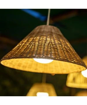 Suspension d’extĂ©rieur en rotin lumière 3 intensitĂ©s rechargeable Calobra, et dotĂ©e d’une corde (L300cm) et d’un abat-jour de forme conique en rotin.