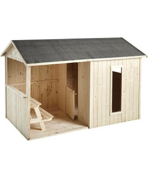 La maisonnette Jazz est équipée d’un plancher, d’un toit en feutre bitumeux, d’un préau avec une petite table et un banc, d’une porte, et de trois fenêtres dont deux avec plexi.