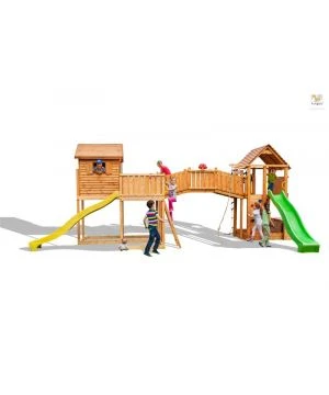 Il y a Ă©galement un kit en bois complet, un ensemble de connecteurs mĂ©talliques, un ensemble d’outils d’installation, de lunette, d’un gouvernail ainsi que des instructions d’installation « étape par Ă©tape » avec les règles de sĂ©curitĂ©. Pour finir vous retrouverez des roches pour le mur d’escalades jumelles, un volant, une corde, une Ă©chelle de corde et une maisonnette avec un toit Ă deux versants, portes et volets.