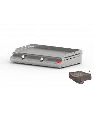Plaque de cuisson 79x40cm, épaisseur 5mm, Renforts anti-torsion, Découpe possible sur la plaque, Pas de migration entre la plaque et les aliments, pas de modification du goût des aliments Caractéristiques techniques 2 Brûleurs à bande large décalés pour laisser une zone de cuisson basse ou de réservation – Allumage Piezzo électronique intégré aux boutons – Bac à graisse incliné intégré sur façade – Pieds réglables en hauteur – Caisson de combustion isolé de la structure pour la sécurité et la performance thermique – PGS : sécurité coupure gaz – Housse de protection PLANET