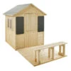 Il y a également, un kit en bois complet, un jeu de fixations métalliques, un ensemble d’outils d’installation, des instructions d’installation « étape par étape » avec les règles de sécurité, une lunette, un volant, des roches pour les murs d’escalade, des cordes d’escalade et 2 sièges rouge avec crochets.